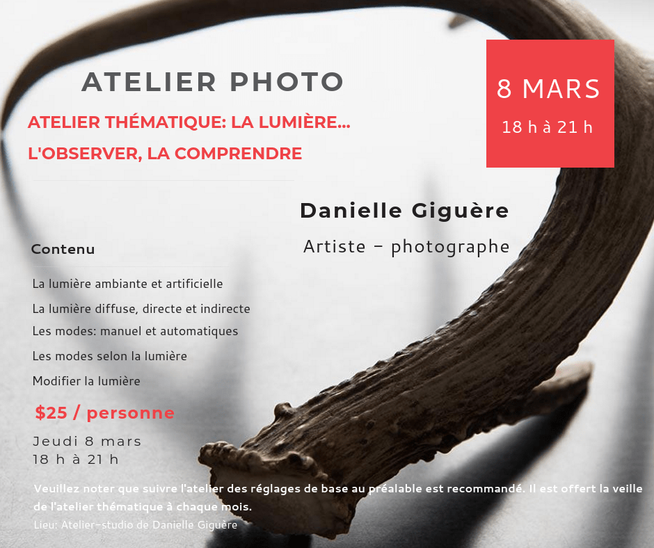 * Bien qu’il ne soit pas obligatoire, il est fortement recommandé d’avoir suivi l’atelier des réglages de base de l’appareil photo pour tirer le maximum des ateliers. Il est offert une fois par mois la journée précédent les ateliers thématiques.