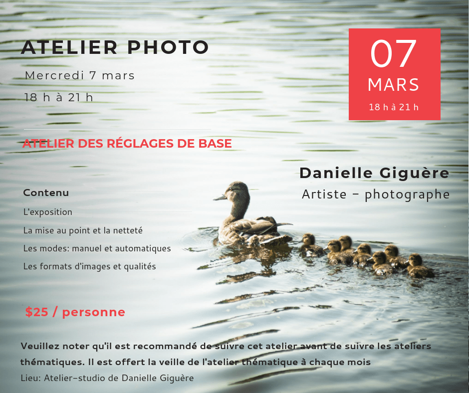 7 MARS, 4 AVRIL, 2 MAI, 6 JUIN Ateliers mensuels d'initiation aux réglages de base de la photographie